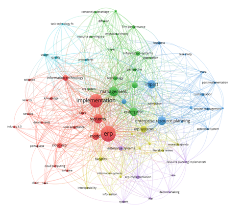 En la Figura 2 se identifican los patrones y relaciones entre las palabras clave de nuestro conjunto de documentos. Es decir, la frecuencia con la que se vinculan las palabras que más se utilizan entre los investigadores. Estas palabras son las siguientes: Aplicación, ERP, Sistemas de Gestión, Tecnología de la información, Rendimiento, Sistema ERP, Sistemas de empresa y gestión de proyectos.