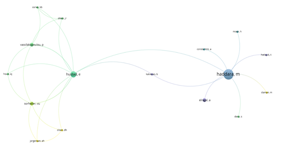En el mapa de concurrencia de la Figura 3 se pueden observar las redes que forman la colaboración entre autores, Moutaz Haddara y Eli Hustad son los autores que más colaboraciones tienen y representan dos clústeres bien definidos dentro del diagrama.