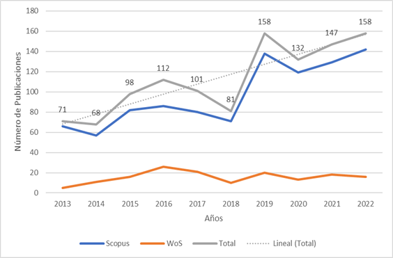 La Figura 1 representa el número de investigaciones publicadas en las bases de datos de Scopus y WoS durante la última década, es decir, el periodo comprendido entre el año 2013 y el 2023. La tendencia en la producción científica denota un crecimiento considerable, en total se identificaron 1157 documentos relacionados con el tema ERP y las TICS, con una tasa de crecimiento anual del 4%. Cabe destacar que en el 2018 hubo una caída en el número de documentos publicados; sin embargo, en los últimos 5 años se han publicado más de la mitad de ellos, lo que refleja el interés de la comunidad científica y académica en el tema. La base de datos Scopus es la que contiene la mayor cantidad de documentos, ya que representa el 86% del total, mientras que WoS ocupa el 14%. En el año 2023 se han publicado 9 artículos hasta la fecha de búsqueda, los mismos que en la gráfica influirían negativamente en la tendencia.