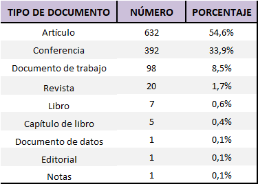 La Tabla 2 presenta información sobre los diferentes tipos de documentos que incluye varias categorías, se registra que el mayor número de publicaciones corresponde a Artículos, que representan más de la mitad de las publicaciones con el 54,6%. Esta información es útil sobre la distribución de los diferentes tipos de documentos que se encuentran en un conjunto de datos, lo que puede ser de gran utilidad para investigadores, académicos o cualquier persona interesada en el análisis de datos relacionados con publicaciones académicas.
