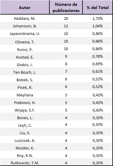 La Tabla 3 enumera los 20 autores más productivos y el porcentaje de publicaciones que cada uno ha contribuido a un campo de estudio. En este caso, los autores más productivos y sus contribuciones se presentan en orden descendente. De acuerdo al número de documentos publicados, Moutaz Haddara es el autor más destacado.