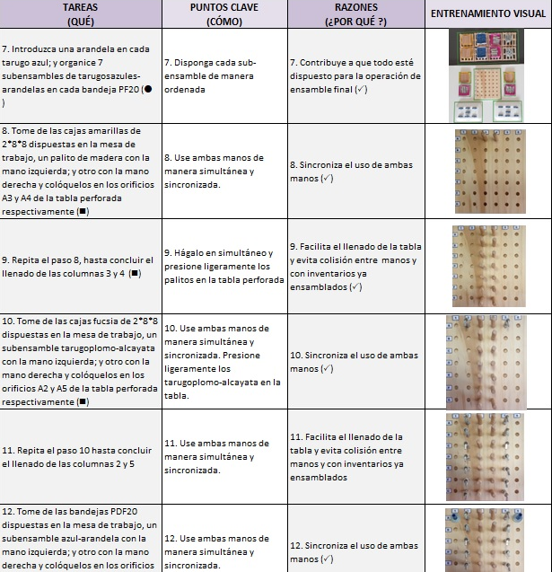A cada estudiante del grupo de operarios se le proporcionaron por escrito las instrucciones para la ejecución de las tareas. Las instrucciones suministradas fueron normalizadas; es decir, se dotó al operario de un work-standard para ensamblar la tabla perforada (ver Tabla 1). En esta segunda corrida simulada, los tiempos de setup y ensamblaje de la tabla perforada fueron cronometrados y registrados por el grupo de Ingenieros Industriales, y la productividad de cada operario fue calculada. La información detallada puede ser apreciada en el apartado de resultados.