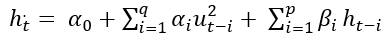 [6]The GARCH model (generalized autoregressive conditional heteroscedastic conditional model) uses the variance and its lags () where is the volatility factor and the shocks that affect the model and it is required that: