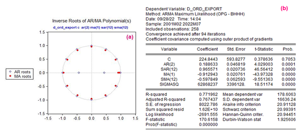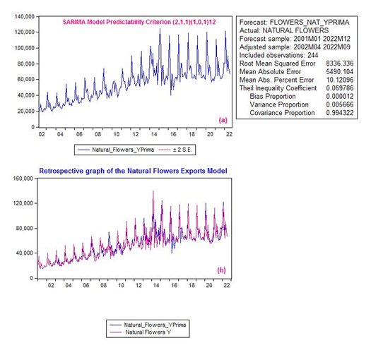 By obtaining a graph in Eviews that breaks down the seasonality of the export series, it is possible to observe monthly periods that experience high FOB values, such as February, March, and May throughout the entire statistical series; and, in the case of Ecuador, it corresponds to events such as Valentine's Day as well as Mother's Day, when sales experience their highest economic growth internationally, and that according to Reinoso (2016, as cited in Cedillo Villavicencio et al., 2021), there are periods of high demand at high prices as well as low demand for the product, generating low export values to the Ecuadorian economy as is shown in Illustration 3 (b).