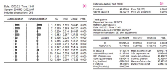 [8]The DW coefficient of 1.925606 allows us to accept the null hypothesis of independence of the residuals (Altamirano Pérez et al., 2022). With respect to the analysis of the squared residuals we observe that the model suffers from heteroscedasticity, since the probability values are less than 0.05, and the null hypothesis of homoscedasticity is rejected (see Illustration 5 (a)).