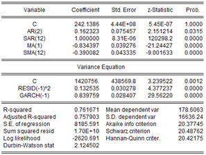 Finally, the use of the GARCH methodology in time series analysis has proven to be an effective tool in government economic policy and in making decisions about incentive policies associated with seasonal variables of SARIMA models because it can accurately identify and model the volatility of economic data and help governments make more efficient decisions.