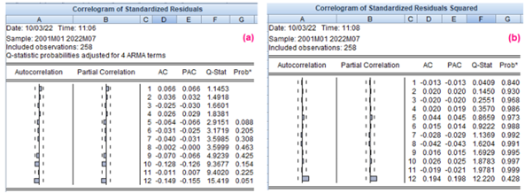 The next stage correlates with the prediction according to the proposed ARIMA methodology. Therefore, we proceed to determine the predictability criteria in Illustration 9 (a) for model 10, the results of which are presented below: