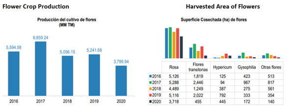 With respect to production and harvested area, their evolution over the last five years can be seen in Illustration 1 below, taking into account that the rose is the most sold species in the local and international market.