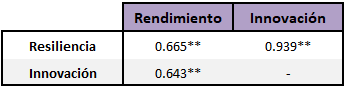 El análisis de correlación de Spearman presentó grado de asociación entre la resiliencia, la innovación y el rendimiento; resultado que demuestra que las variables estudiadas son potencialmente importantes. Las tres variables revelan correlaciones positivas significativas (entre 0.643 y 0.939; p = < 0.001); la magnitud de la asociación que presentan tiene un efecto grande (Cohen, 1988: grande 0.50, mediano 0.30 y pequeño 0.10) (Tabla 1).