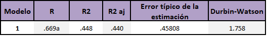 En la Tabla 2, se presenta el modelo de regresión que explica el 44.8 % de la varianza de la variable dependiente (rendimiento). El puntaje DW indica que se cumple el supuesto de independencia de errores, el criterio se mantiene entre 1.5 y 2.5. En la Tabla 3, la anova indica que existe una relación significativa entre las variables rendimiento y resiliencia. La Tabla 4 presenta la t y su significancia que indica que solo la variable resiliencia aporta significativamente al modelo de predicción, ya que este excluye la variable innovación, de tal forma que la ecuación de predicción es y = 1.483 + .612 (Resiliencia) y por tanto la hipótesis planteada se acepta parcialmente.