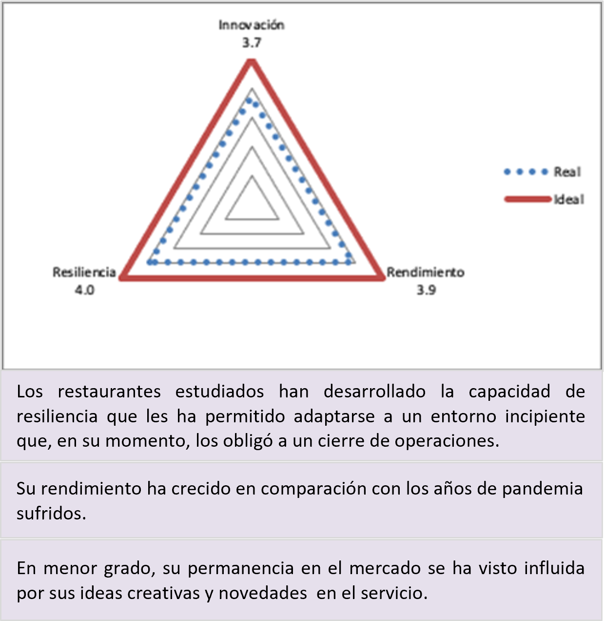 Los restaurantes estudiados respondieron resilientemente a un evento adverso (x̄ = 4.0 ; σ = 0.67) asumiendo actividades de innovación (x̄ = 3.7; σ = 0.707), que, además de permitirles seguir en el mercado, lograron un incremento en su rendimiento (x̄ = 3.9; σ = 0.612) (Figura 1).