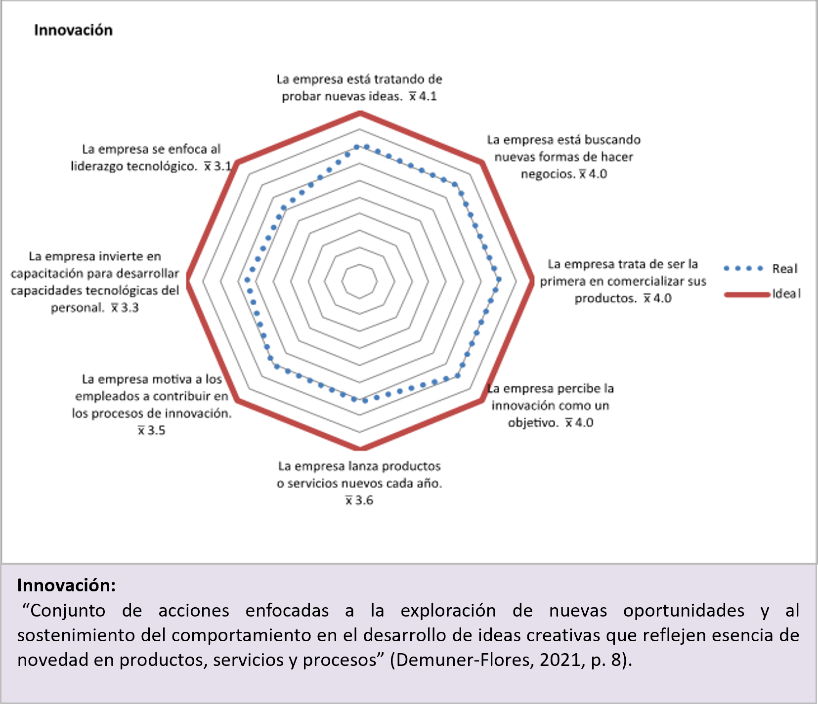 Las empresas han desarrollado acciones encaminadas a mantener la capacidad de innovación, han probado nuevas ideas, nuevas formas de hacer negocios y se esfuerzan en el proceso de comercialización y en considerar la innovación como un objetivo. Con puntuación menor a la media, estas empresas ofrecen nuevos servicios cada año y toman en cuanta a su personal para incentivar la innovación (Figura 3).