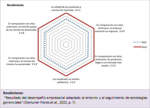 Por su parte, el rendimiento es un término asociado al desempeño que representa el resultado de la armonía de ciertos indicadores que pueden ser cuantitativos, cualitativos o combinados (Demuner-Flores et al., 2022). Estos autores definen el rendimiento como el “resultado del desempeño empresarial adaptado al entorno y al seguimiento de estrategias gerenciales” (Demuner-Flores et al., 2022, p. 7), en el cual los indicadores que se incorporan se refieren al incremento de ingresos, crecimiento de ventas, incremento en el número de clientes, mejoramiento de la calidad de los productos, incursión en mercados más amplios, reacción de la competencia y satisfacción de clientes y empleados. Estos autores usan tales indicadores, debido a que, especialmente las empresas de menor tamaño, dudan o se rehúsan a aportar indicadores cuantitativos que revelen sus ingresos, costos, utilidades, contribución marginal, ROI, etc.