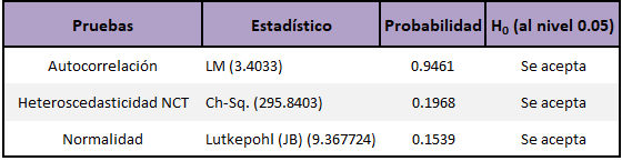 En cuanto a la correcta especificación del modelo, se cumple satisfactoriamente con las pruebas de autocorrelación, heteroscedasticidad y distribución normal (véase Tabla 2). Respecto a las pruebas de exogeneidad en el sentido de Granger se halló que todo el conjunto es endógeno, excepto la variable de la productividad laboral manufacturera local (Chi-Sq=9.482144; prob= 0.7990>0.05).