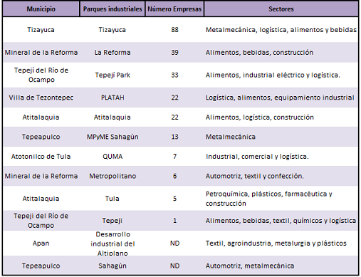 A pesar de que la economía hidalguense ha estado dominada por las actividades terciarias desde el inicio del siglo XXI, la industria manufacturera ha sido importante en la entidad desde el siglo XIX, cuando varios municipios se especializaron en algunos subsectores. En la década de 1990, se implementaron políticas para fomentar el crecimiento industrial y la productividad (Vázquez Rojas et al., 2016). Sin embargo, estos esfuerzos se han centrado principalmente en la región sur del estado, que cuenta con infraestructura adecuada y donde se han creado 12 parques industriales que ofrecen servicios básicos para empresas manufactureras y de logística (Central Business Park, 2021). Entre los parques industriales, los que destacan en número de establecimientos son Tizayuca, La Reforma, Tepeji Park y PLATAH (Secretaría de Desarrollo Económico [SEDECO], 2023) (véase Tabla 1).