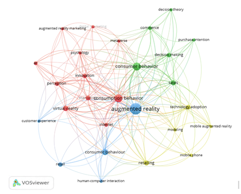 En la Figura 2 se puede observar el Mapa de Redes de coocurrencia de palabras clave de la literatura de las variables de consumer behaviour y augmented reality, de las cuales se identificaron cuatro clústeres definidos, el clúster rojo engloba al Consumption behaviour, virtual reality, innovation; el clúster azul engloba a Augmented reality, consumer behaviour, retail; el clúster amarillo engloba a Retailing, technology adoption, mobile augmented reality; y, finalmente, el clúster verde engloba al Consumer behavior, sales, decision making.