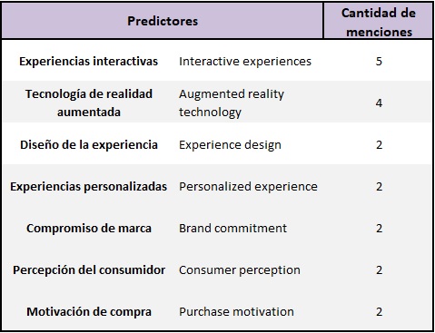 De acuerdo con los patrones identificados, estos fueron divididos en predictores y dependientes. En las variables predictoras se tiene a las experiencias interactivas y la tecnología de Realidad Aumentada como la más mencionada en los artículos de la revisión. Las experiencias interactivas son el rasgo inherente de la tecnología de Realidad Aumentada, pueden proporcionar un fuerte sentido de inmersión e involucramiento, lo que se deriva en un reforzamiento del compromiso de parte del consumidor (Bilgihan et al., 2024). Y su aplicación más conveniente es la habilidad de probar productos virtualmente antes de hacer una compra, los consumidores valoran considerablemente esta característica de la Realidad Aumentada, ya que les brinda confianza en sus decisiones, comodidad, inspiración, disfrute y sienten que se reducen o no toman riesgos. Brinda la oportunidad de combinar y aprovechar los beneficios de los espacios físicos y los virtuales para crear versiones realistas de los productos. Los consumidores prefieren la tecnología de Realidad Aumentada, ya que disfrutan de usarla y se divierten con ella; sin embargo, no se ha estudiado cuáles son las características y motivaciones que contribuyen a esto (Kumar et al., 2024).