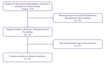 De esa búsqueda se derivaron una cantidad de 150 documentos, de los cuales fuimos descartando de acuerdo con ciertos criterios de exclusión, que fueron los siguientes: a) Estudios realizados únicamente en el área de Businness, Management and Accounting. b) El tipo de documento sea artículo. De esta búsqueda limitada se obtuvieron como resultado 47 documentos.
