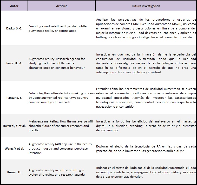 Los artículos que estudian augmented reality y consumer behaviour proponen que para futuras investigaciones se analice si el metaverso utilizado para el digital marketing tiene beneficios para el bienestar del consumidor y la creación de valor para este. Además, se propone que se investiguen diferentes aspectos de la realidad aumentada como su lado social, su lado "oscuro" o negativo, y si podría ser utilizado como una estrategia protagonista para el marketing. Se ha visto un incremento en la aplicación de este medio en el retail, usualmente utilizado de forma online, por lo que se sugiere investigar la viabilidad de esta tecnología de forma omnicanal, es decir, utilizar esta tecnología en tiendas físicas para enriquecer su experiencia de compra. Finalmente, se hace énfasis en conducir estudios que no solo estén enfocados en los millenials y la generación Z, ya que esta tecnología se está integrando en la vida de todas las generaciones y se debe conocer los efectos en cada una de ellas. Es así como la Tabla 8 identifica futuras líneas de investigación.