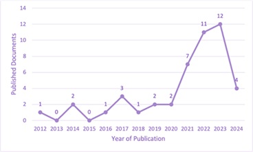 En esta sección se presentan los resultados de los análisis bibliométricos de los artículos que estudian las variables de consumer engagement y augmented reality. En primer lugar, se observa en la Tabla 1 y en la Figura 1 que, en cuanto a los años de publicación de los artículos, se ha empezado a indagar sobre estos tópicos desde el año 2012, en el cual se produjo la primera investigación. Las indagaciones aumentaron para el año 2014, pero no fue hasta el año 2016 cuando se empezó a investigar interrumpidamente sobre estas variables. Ha sido un tema que ha crecido notablemente en interés a partir del año 2021, lo que denota su novedad y la oportunidad para realizar exploraciones que aporten a nuevos conocimientos a la literatura.
