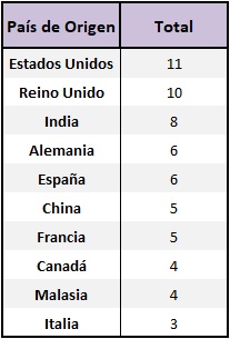 Para averiguar los países que han producido más investigaciones sobre el tema, se utilizó un top 10 sobre los países de origen de los journals. Con 11 artículos, Estados Unidos es el país con mayor número de publicaciones, seguido por el Reino Unido en segundo lugar con 10 artículos. Y, finalmente en tercer lugar, India con 8 artículos. Esta información se ve reflejada en la Tabla 2.