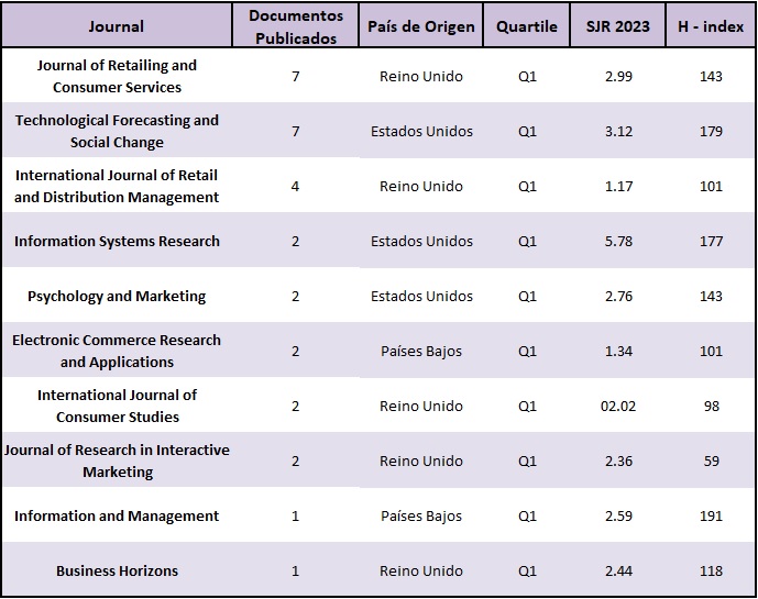 En la Tabla 3 se muestran los journals con mayor publicación de documentos. Se realizó un top 10, que tuvo en cuenta el número de artículos publicados como primer criterio, el cuartil, el SCImago Journal Ranking y el H-index para el ranking de estos. Se observa que los journals que más estudian las variables de consumer behaviour y augmented reality de mejor ranking provienen del Reino Unido, Estados Unidos y los Países Bajos, acumulando 16, 11 y 4 artículos publicados respectivamente.