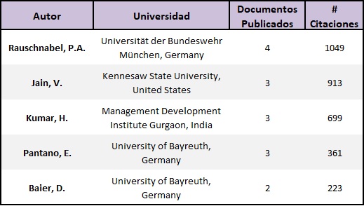 En la Tabla 4 se puede encontrar el ranking Top 5 de los autores con más artículos publicados sobre las variables estudiadas y el número de citaciones que tiene cada uno. Rauschnabel, P.A. tiene 4 publicaciones, Jain, V., Kumar, H., Pantano, E. tienen 3 publicaciones cada uno y Baier, D. posee 2 publicaciones. Además, se puede identificar que 3 de estos autores vienen de universidades de Alemania, y dos de ellos son provenientes de University of Bayreuth.
