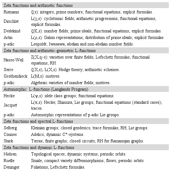 In Table 1 we offer a selection of mathematical objects with an associated zeta function or L-function. Some of the entries in Table 1 constitute fields and research programmes which are currently very large, such as the functions grouped under the name automorphic L-functions, which form the profound and extensive Langlands programme, offering a highly unifying vision of the Diophantine world. Readers who are interested in further information should check, among other citations, Bayer & Neukirch, 1978; Berry & Keating, 1999; Du Sautoy, 2003; Euler, 1737; Lagarias & Odlyzko, 1987; and Riemann, 1859, for the arithmetic case. For the arithmetic-geometric case, Deligne, 1974 and Weil, 1949; for spectral L-functions, Connes, 1999; Katz & Sarnak, 1999; Odlyzko, 2001; and Selberg, 1956, and for those related to dynamical systems, Deninger, 1998 and Lapidus & Van Frankenhuysen, 2001.
