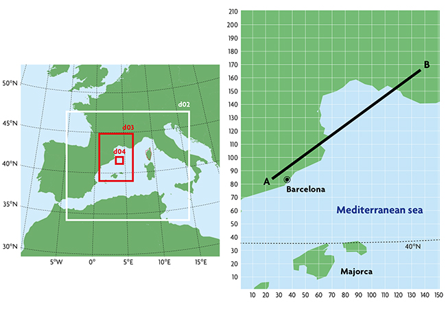 Jeroni LorenteFigure 4 (left panel) shows the domains covered by the numerical simulation, and the extension of domain 3 (right panel) in which line AB indicates the direction of the vertical cross sections of the atmosphere used for the temperature and humidity analysis.