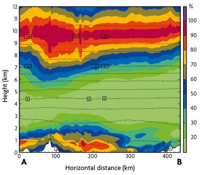 Figure 5 shows the vertical cross section along the line AB in Figure 4 (right panel) of the humidity relative to the ice (in colours) and air temperature (dashed lines) at 11:00 UTC on the day in question. A layer of very humid air is detected around the 10 km level height, with humidity over 90 %. If humid air from the combustion of kerosene is introduced at this level, it could lead to the saturation and deposition of water vapour. Below this layer, humidity decreases quickly (to 70–80 % at 8,500 metres and 50 % at 8,000 metres). The humidity contribution from combustion-derived water crystals required at these levels would be much higher, so saturation would not be as fast.