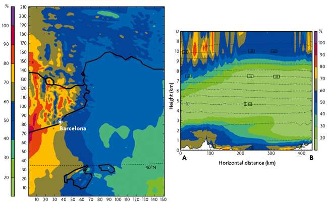 The atmospheric conditions in which the ice crystals that form contrails are found can change both in time and space. The numerical simulation performed to describe the atmospheric conditions on 21 September 2011 described above allows us to identify a great variability in the areas of humidity that are more or less favourable to contrail permanence a few hours before and after 11:00 UTC. Figure 6 shows the horizontal distribution of humidity at 9,500 metres (left panel) and the vertical profile of relative humidity and temperature along line AB (right panel) at 02:00 UTC (4 a.m. local time) on 21 September 2011. The simulation shows unconnected areas with humidity conditions over 80 % (in red), which are thus, conducive to maintaining ice crystals, and areas with values below 70 %, that are favourable to the evaporation of ice crystals (in green and blue).