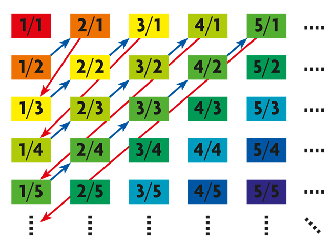 Applying his definition to the set of all positive integers, , and to the set of all rational numbers (those that can be written as where and are integers, and ), he proved that they both had the same cardinal. This is the smallest infinite cardinal, and is denoted . When is the cardinal of a set, since a bijection between it and the set of positive integers exists, the elements in the set can be written as a sequence. It is not too difficult to understand the proof that the cardinal of is when one knows the procedure. We consider a rational number written as an irreducible fraction where and are positive and the sum is a fixed amount. If , then: