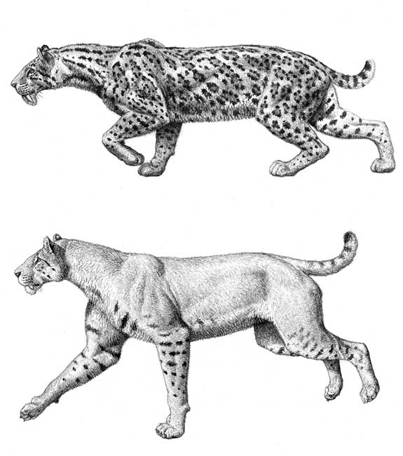 Reconstructions of the saber-toothed felids Megantereon (top) and Homotherium (bottom), according to Mauricio Antón. The presence of these felids in Pleistocene forests may have been beneficial for the hominids who cohabited with them. Their powerful canines were good at knocking down prey, but not so good at defleshing. Thus, considerable amounts of meat were left to be consumed by hominid scavengers.