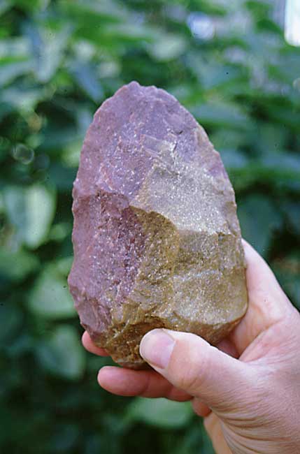 A quartzite hand axe, named Excalibur, recovered at the Sima de los Huesos, in the Main Cave of the Atapuerca mountains. The transition from the use of these tools to flakes and blades proves that there was a synthesis and evolution with great diversification. Blade production is not exclusive to our species: others, including the Neanderthals, also developed it.