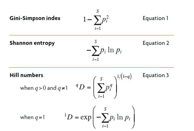 The most important mathematical expressions used for the calculation of ecological diversity. S = number of species; p1 = the relative abundance of i -th species, the number of individuals of species i in the community divided by the total number of individuals of all S species; q is a free parameter that determines the measure's sensitivity to species relative abundances.