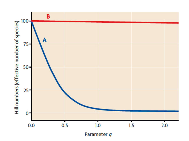 Diversity profiles of two communities with the same number of species (s = 100) and individuals (n = 1,000), but different evenness. In profile A, there are a few very dominant species, while the rest are less abundant. In profile B, all species have a similar number of individuals, i.e., there is more evenness. The Hill numbers (the effective number of species) are used as a master formula to compare the effective number of species in a simple way with parameter q, which determines the sensibility of the measure to relative abundance. This allows us to compare –graphically as well– different diversity profiles like A and B. Both have the same number of species and, therefore, the same order q = 0 diversity, but the distribution of individuals in each species is different. A greater imbalance (less evenness) involves less order 1 and order 2 diversity for community A.