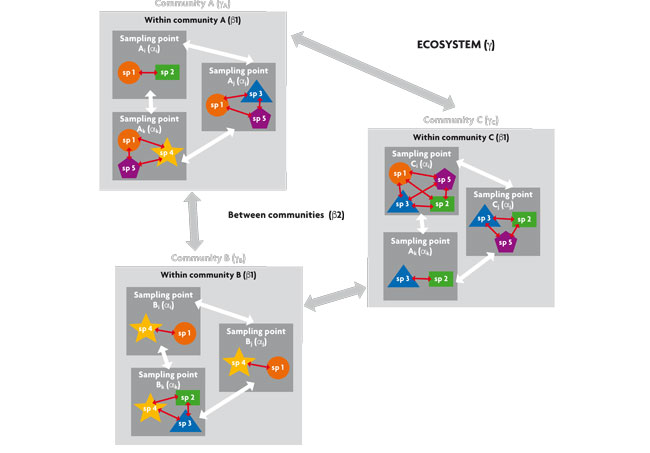 Historically, ecologists soon became aware that biological variability can present different patterns depending on the scale at which it is analysed. Whittaker (1960) was the first to describe the different spatial components in which biodiversity can be measured; he proposed dealing with the study of biodiversity along several hierarchical spatial scales (Figure 1). Thus, he defined gamma diversity (γ) as the diversity of species within a region or ecosystem. In contrast, the lowest hierarchical scale, corresponding to the sampling point, was called alpha diversity (α). Lastly, he defined beta diversity (β) – which establishes the dissimilarity between two comparable modules, normally within the same hierarchical level – as the dissimilarity in biodiversity between several sampling points.
