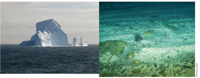 Stefano AmbrosoOn the right, a drag mark left by an iceberg such as that shown in the image on the left. This is the most important natural disturbance that affects the seabed of Antarctic platforms. Any environmental phenomenon, such as global warming, that increases the presence of icebergs, will have important consequences for Antarctic seabed life.