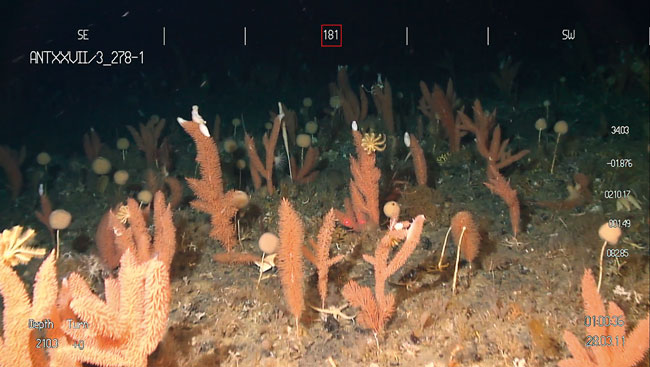 Very dense population of gorgonians, sponges, and bryozoa, with individuals or colonies of different sizes. In Antarctica, populations of sessile species, in addition to specimens of different ages which are fruit of a long process of colonisation and growth, are present at high densities.