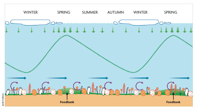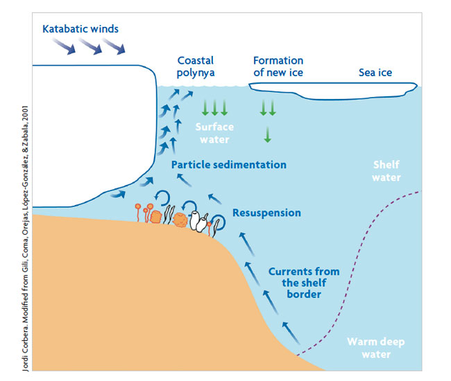 Jordi Corbera. Modified from Gili, Coma, Orejas, López-González, & Zabala, 2001Annual fertilisation cycle of benthic communities. Green arrows represent plankton dropping each spring from the marine ice to the sea bottom. This food accumulates on the seabed as a green carpet and can feed the life of the Antarctic seabed shelves for months. Blue arrows represent the seabed currents. Purple arrows represent the resuspension caused by these currents.