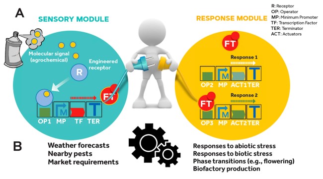 This diagram shows how plants are equipped with new genetic circuits which turn them into «smart» plants. (A) The principles of modularity and standardisation, typical of synthetic biology, facilitate the physical connection between genetic elements and, therefore, the construction of increasingly complex regulatory circuits. (B) Applied to genetic improvement, these circuits would allow externally operated signals to be connected with endogenous regulation circuits such as those that govern stress responses or phase changes, etc.
