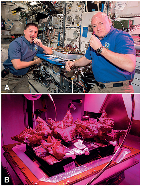 A) NASA astronauts Scott Kelly (right) and Kjell Lindgren (left) snack on freshly harvested space-grown lettuce as part of the Veg-01 experiment. B) Facilities of NASA’s «Vegetable Production System» project («Veggie») at the International Space Station. The picture shows the Veg-01 nursery containing red romaine lettuce seedlings.