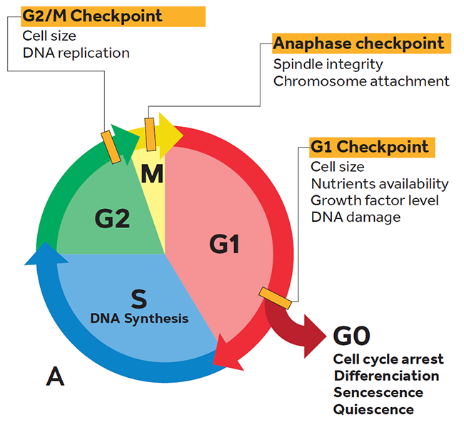 The four phases are represented (G1, S, G2 and M – mitosis), as well as the checkpoints, in which regulatory processes take place. In each checkpoint, the specific processes and parameters to be checked are indicated. When cells cease their progression throughout the cell cycle, they enter in the G0 phase. The fate of G0 cells is variable and the major alternatives are indicated.
