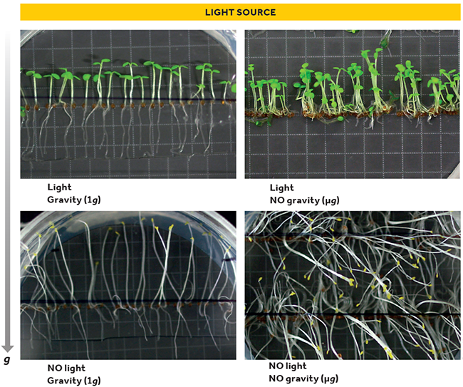 NASA TVAlthough some of the analyses are still in progress, new phototropic responses to blue light in space have already been identified, which complement previous findings. Furthermore, a positive effect of red light in counteracting the stress caused by microgravity on cell growth and proliferation in the root meristem has been found (Valbuena et al., 2018), which was confirmed by a global transcriptomic study. Therefore, it appears that (red) light could be a factor promoting adaptation of plants to microgravity and it can be used to mitigate gravitational stress for the culture of plants in space.