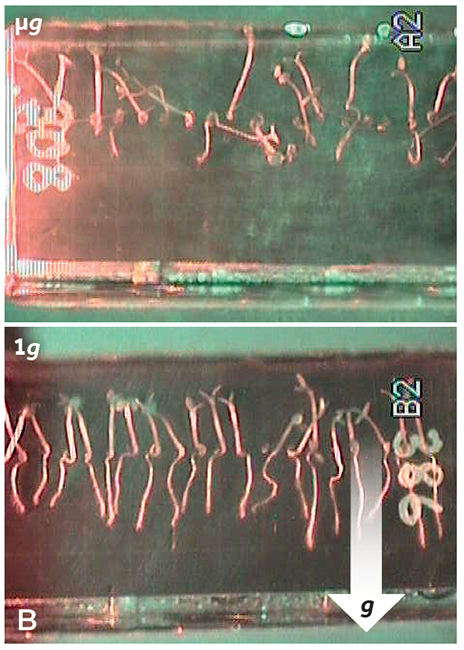 µg represents microgravity and 1g represents control ground gravity. In this case, 1g seedlings grew in an on-board centrifuge rotating at this angular speed. The orientation of the growth of seedlings greatly differs in the two cases. The direction of the gravity vector (g) in the control experiment is indicated.