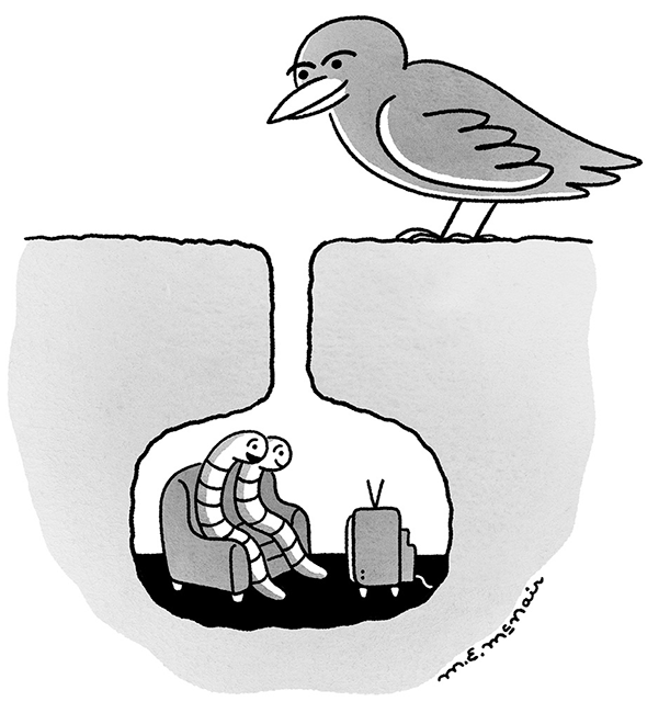 In Elizabeth McNair’s cartoon, published in The New Yorker on 11 May 2020, the virus is conceptualised as a bird of prey ready to eat some worms as soon as they leave the house.