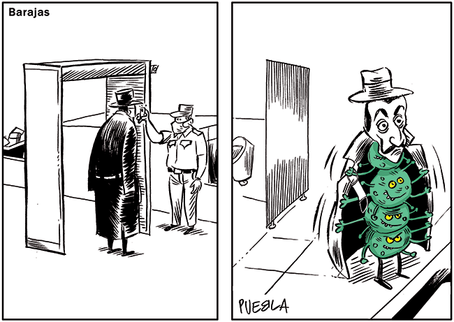 A frequent use of metaphors in cartoons consists of making the virus visible by showing it as a person, an animal, a force of nature, or even a monster or an alien. This emphasises its presence and threat. Above, a cartoon by Puebla titled «Barajas. Everything under control», published in the newspaper ABC on 13 July 2020.