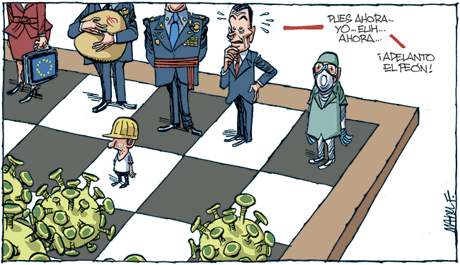Criticisms of political management can be observed in the metaphorical description of the pandemic as a game of chess in which health workers and essential workers are the pawns, sacrificed so that the rest of the pieces (politicians, the army, and the European Union) can survive. Cartoon by Manel Fontdevila published in El Diario on 10 April 2020.