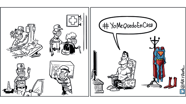 Other metaphorical uses were found that emphasised the recognition of essential workers, especially healthcare workers, as angels or superheroes. Above, a cartoon by Miki and Duarte, published in Diario de Sevilla on 28 March 2020.