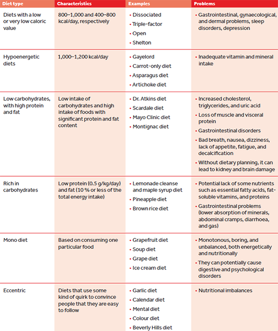 These and other similar diets are still present in our everyday lives. However, resources are available to detect them: all of them promise rapid weight loss (more than 1 kg per week), their advocates claim they can be followed effortlessly, they impose excessive energy restrictions, and the diet excludes foods or nutrients that are important for our bodies. These diets can endanger the health of individuals because they do not incorporate balanced and sufficient amounts of the nutrients necessary for normal body functioning.
